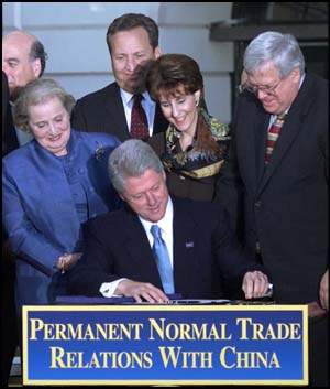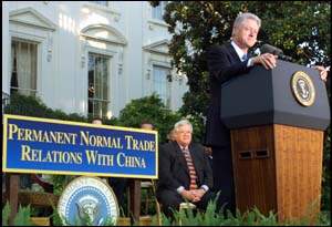 圖文:克林頓簽署PNTR法案 2000年10月11日 11:35 克林頓在多名曾為PNTR法案不斷努力的官員陪同下,正式簽署PNTR法案,為中美關(guān)系邁入一個(gè)歷史性的新里程。 克林頓在總統(tǒng)任期內(nèi)完成心愿,簽署PNTR法案,他形容這是他在任期內(nèi)的一大勝利。(圖據(jù)外電) 中新社華盛頓十月十日電(記者徐德金)美國總統(tǒng)克林頓今天下午在白宮南草坪舉行儀式,簽署了對華永久性正常貿(mào)易關(guān)系(PNTR)法案。由此,這項(xiàng)已在國會(huì)眾議院、參議院通過的法案成為法律,正式生效。 白宮說,克林頓簽署PNTR法案是美中關(guān)系的歷史性時(shí)刻,中國將向美國的商品與服務(wù)業(yè)打開市場,加強(qiáng)美中關(guān)系。 中、美兩國政府于去年十一月十五日在北京簽署關(guān)于中國加入世界貿(mào)易組織的雙邊協(xié)議,這份被稱作“雙贏”的協(xié)議,促進(jìn)了中美兩國經(jīng)貿(mào)關(guān)系,也加快了中國邁向WTO的進(jìn)程。 今年三月,克林頓向國會(huì)提交了一項(xiàng)關(guān)于給予中國永久性正常貿(mào)易關(guān)系地位的立法建議。此后數(shù)月,克林頓及美國聯(lián)邦政府高級官員不斷呼吁、敦促國會(huì),盡早審議、通過PNTR案。今年五月二十四日,眾議院以二百三十七票對一百九十七票批準(zhǔn)了PNTR案;九月十九日,參議院又以八十三票對十五票的壓倒性多數(shù)通過了該案。 該法案生效后,將結(jié)束二十年來美國國會(huì)每年審議一次對華“正常貿(mào)易關(guān)系”(一九九八年前叫“最惠國待遇”)的歷史,與中國建立永久正常貿(mào)易關(guān)系。實(shí)現(xiàn)美對華永久正常貿(mào)易關(guān)系符合世貿(mào)組織的規(guī)定,符合中美兩國人民的根本利益,有利于推動(dòng)中美經(jīng)貿(mào)合作和中美關(guān)系繼續(xù)向前發(fā)展。 不過,人們注意到克林頓今天簽署的法案,包含了干涉中國內(nèi)政、損害中國利益的內(nèi)容。中方已向美方表明了堅(jiān)決反對的嚴(yán)正立場。 美國方面稱,過去二十年,美中貿(mào)易已從無關(guān)緊要的水平提高到每年增長一百四十億美元的水平。今后,美國產(chǎn)品將更容易進(jìn)入一個(gè)超過十二億人口的市場。 (完) |