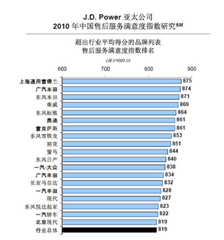 2010年中國售后服務滿意度指數(shù)調(diào)研主要是衡量車主在購車的12至24個月期間,對中國市場授權經(jīng)銷商提供的保養(yǎng)和維修服務的滿意度。報告評測了五個要素:服務質(zhì)量、服務后交車、服務啟動、服務顧問以及服務設施。設置總分為1000分,前三名分別獲得875、874、871的評分。