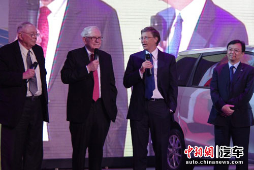 中新網(wǎng)9月29日電 29日,比亞迪M6在全國(guó)近30站分站上市的收官之作在京舉行。在300多家媒體苦等將近兩小時(shí)候后,12點(diǎn)20分,股神巴菲特、伯克夏哈撒韋公司副主席查理·芒格、微軟前董事長(zhǎng)比爾·蓋茨同比亞迪總裁王傳福乘坐M6現(xiàn)身發(fā)布會(huì)。