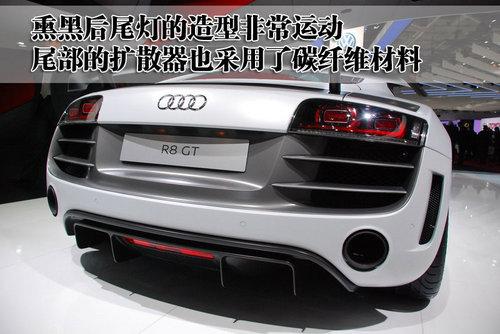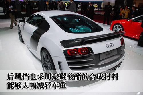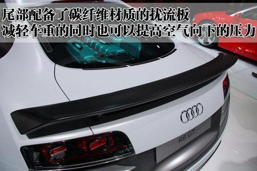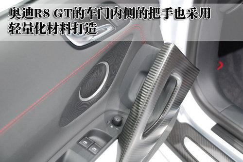 奧迪R8 GT的后風(fēng)擋也采用聚碳酸酯的合成材料打造,有助于車身的重量減輕。而且這款車的尾部配備了碳纖維材質(zhì)的擾流板,在減輕車重的同時(shí)也可以提高空氣向下的壓力,達(dá)到高速、穩(wěn)定的效果。