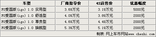 據比亞迪汽車4S店銷售人員介紹,比亞迪F0愛國版igo系列車型的現(xiàn)車并不是很齊全,實用型和舒適型都有現(xiàn)車,尊貴型和旗艦型則需要預訂,大概10-15天即可提車。而目前1.0L實用型和舒適型都有現(xiàn)車,其中實用型可以優(yōu)惠5000元,而其他車型只可以優(yōu)惠2000元現(xiàn)金。