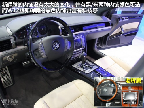 與它經(jīng)過少許修改的外觀不同,新輝騰的內(nèi)飾幾乎沒有變化,整車主要有兩種配色:原木色+米色與黑+銀色可選。車內(nèi)的設(shè)計(jì)、布局與老款車型完全相同,新輝騰W12版車型采用黑銀色內(nèi)飾+米色座椅,與典雅的V8車型所采用的原木色相比更富有冷冷的科技感。