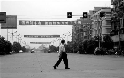 進入夾江城區(qū),主要街道上隨處可見禁止酒后駕車的宣傳橫幅。其中,縣城瓷都大道與迎春南路交會處的兩條標語尤為醒目,上面分別寫著“酒后駕車者醫(yī)院給你開好了房間”“酗酒開車是駛向死亡與墳墓的選擇”等警示內(nèi)容。