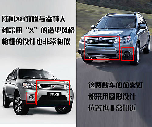 陸風(fēng)X8的前臉與森林人非常相似,都采用“X”型的設(shè)計風(fēng)格,而且前臉進(jìn)氣格柵的風(fēng)格與森林人也非常相似。除了這些,陸風(fēng)X8還配備了前霧燈,并采用圓形的設(shè)計風(fēng)格,這也與森林人的造型相近。