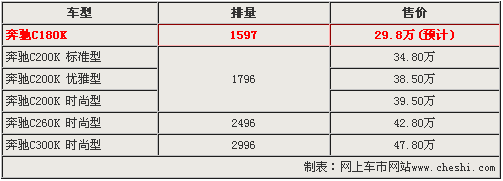 目前,北京奔馳新C級(jí)轎車(chē)共有3個(gè)排量五款車(chē)型,而入門(mén)級(jí)車(chē)型奔馳新C200K 標(biāo)準(zhǔn)型的售價(jià)為34.8萬(wàn)元。由于奔馳新C200K 標(biāo)準(zhǔn)型在經(jīng)銷(xiāo)商處可以?xún)?yōu)惠2萬(wàn)元左右,所以奔馳新C180K車(chē)型作為奔馳新車(chē)的入門(mén)車(chē)型,預(yù)計(jì)售價(jià)為29.8萬(wàn)元。同時(shí),與售價(jià)分別為28.3萬(wàn)和29.1萬(wàn)的寶馬318i和奧迪A4L1.8T形成真正的抗衡。