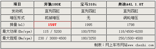 奔馳新C180K車(chē)型雖然僅搭載1.6升排量引擎,但其最大功率和扭矩卻高達(dá)115Kw/5200和230Nm/3000-4500,較排量為2.0升的寶馬318i分別高出15 Kw和50 Nm。由于奧迪A4L 1.8T搭載了1.8升燃油直噴渦輪增壓引擎,所以最大功率和扭矩位居三款入門(mén)級(jí)車(chē)型之首。