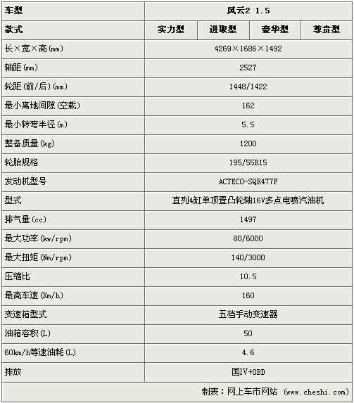 從車身尺寸來看,風(fēng)云2三廂要比新旗云小很多,但在軸距方面卻比新旗云大不少,可以預(yù)計(jì)車內(nèi)空間相當(dāng)?shù)貌诲e(cuò)。在動(dòng)力上,風(fēng)云2裝備的是奇瑞自主研發(fā)的SQR477F發(fā)動(dòng)機(jī),最大功率80kw,最大扭矩140牛米,配合5速手動(dòng)變速器,并且在排放上達(dá)到了國(guó)Ⅳ標(biāo)準(zhǔn)。