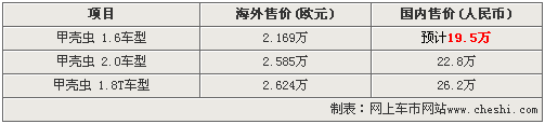 甲殼蟲在海外市場配備1.6、2.0和1.8T三個(gè)排量的多款車型,而甲殼蟲1.6作為入門級車型,其售價(jià)也最便宜。目前甲殼蟲在國內(nèi)僅有2.0和1.8T兩個(gè)排量,雖然廠家指導(dǎo)價(jià)為22.8萬和26.2萬,但實(shí)際市場售價(jià)均可優(yōu)惠3萬元左右。通過國內(nèi)外相同排量車型的售價(jià)可以看出,甲殼蟲1.6引入國內(nèi)的售價(jià)預(yù)計(jì)為19.5萬元左右。