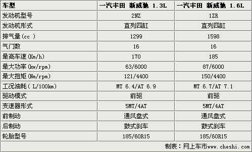 豐田新威馳將繼續(xù)搭載1.3L和1.6L兩款發(fā)動機(jī),來滿足不同消費(fèi)者的需求。這兩款發(fā)動機(jī)都是直列4缸16氣門引擎,具有可變節(jié)氣門技術(shù),在保證強(qiáng)勁動力輸出的同時,又可以達(dá)到了良好的節(jié)油性能,1.6L自動擋車型的百公里油耗僅為7.1L,1.3L手動擋車型的油耗更為節(jié)省,百公里油耗不到6.4L。在動力輸出方面,1.3車型的最大功率和最大扭矩分別達(dá)到了6.3Kw和121Nm,同時1.6車型的最大動力輸出也達(dá)到了87Kw和150Nm。在同級車中絕對稱得上是出類拔萃。在變速器方面,分別裝配上了5速手動變速器和4速手自一體變速器。新威馳的制動器均為前盤后鼓式制動器。