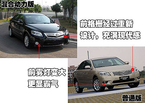 與在美國市場銷售的混合動力凱美瑞相比,即將在國內(nèi)市場上市的這款車型在外觀方面差別還是比較大的。美版混合動力凱美瑞采用了垂直設(shè)計(jì)的霧燈,接近平行四邊形,藍(lán)盈盈的前大燈以及雖然小巧,但很突出的隔柵。