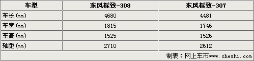 東風(fēng)標(biāo)致308車身尺寸明顯超過了標(biāo)致307車型,4680mm車長、1815mm的車寬和1525mm的車寬,使得標(biāo)致308外形更加大氣,同時在加上2710mm的軸距,進一步確保了標(biāo)致308車內(nèi)空間的寬敞,標(biāo)致307的軸距僅為2612mm。