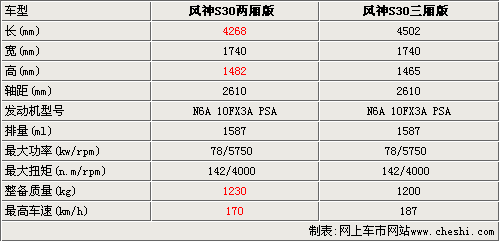 風神S30兩廂版在尾部的車身結構上有明顯變化,所以整車的參數也會隨之改變。通過與三廂車型的參數對比發(fā)現,風神S30兩廂版的車身尺寸有了明顯變化,其中長度縮短了234毫米,高度則增加了17毫米。雖然外形尺寸有明顯變化,但風神S30兩廂版的軸距并無改變,保障了后排的空間優(yōu)勢。風神S30兩廂版依然采用PSA 1.6L發(fā)動機,但整備質量增加了30公斤,多少會影響整車的動力性能,最高車速只能達到170公里每小時。