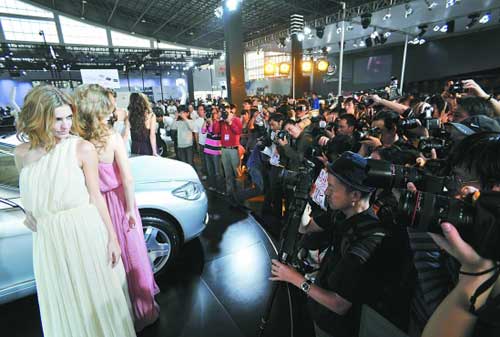 網(wǎng)友“午夜鐘聲”正在奔馳展位上尋找著最合適的拍攝位置,“去年奔馳展位上的洋車模最為出彩,今天肯定要來看一看!彼9點就來到車展主會場,帶著全套攝影裝備,一個小時收獲了300多張照片,“回去整理好就貼我的博客上去!彼d沖沖地說。
