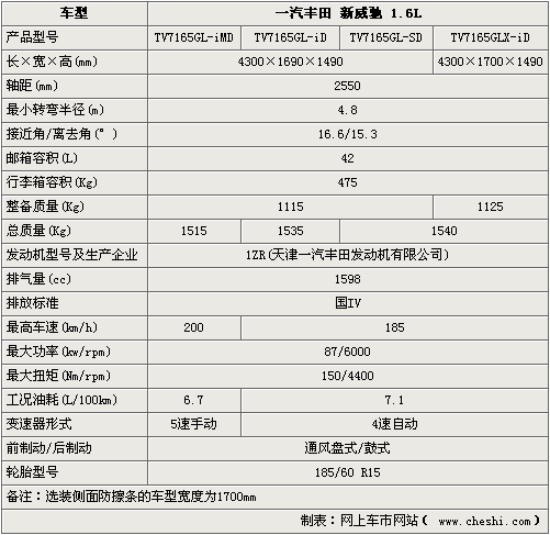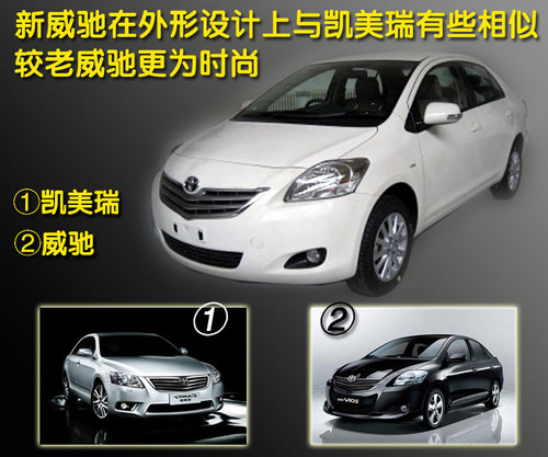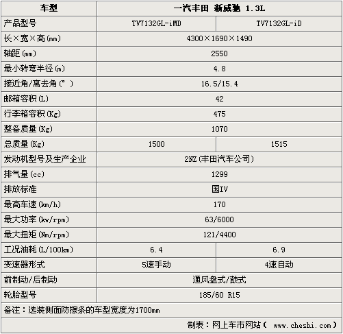 豐田改款新威馳依然由一汽生產,同時將有6款車型推出,變速箱份為4速自動和5速手動。排量上分為1.3升與1.6升。長4300mm×寬1690mm×高1490mm的車身尺寸也與老款車型保持一致,完全可以滿足年輕人在日常中的使用,并且新款車型提供了防擦條選裝件,可增加個性與實用性。