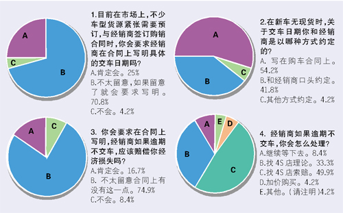 買車時你會仔細閱讀和經(jīng)銷商簽訂的汽車購銷合同嗎?如果你購買的是緊俏車型需要等一段時間才能拿到新車,你會要求經(jīng)銷商在合同上寫明具體的交車日期嗎?上周,本報對消費者買車時會否認真留意汽車購銷合同進行了調查,結果顯示,超過七成的消費者在買車時不太留意汽車購銷合同,不會特別留意合同上有無具體交車日期,也不太留意經(jīng)銷商違約后應承擔什么責任。