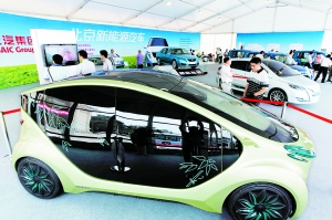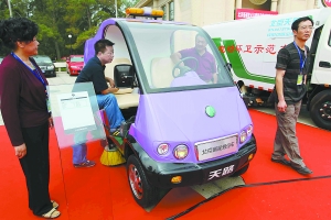 一踏上北京展覽館門前的小廣場,參觀者便立刻被露天擺放在廣場上的各種新能源汽車吸引住了。看起來似乎和普通垃圾車沒什么兩樣的桶裝垃圾運(yùn)輸車與壓縮式垃圾車,實際上卻是靠電池來運(yùn)行的;北汽的新能源汽車最高時速已經(jīng)可以達(dá)到每小時160公里;小型電動汽車“竹風(fēng)”只需要30分鐘即可快速充電80%……