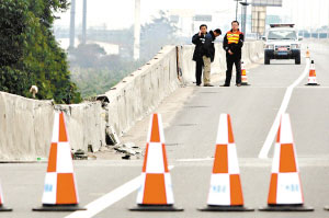 廣深高速的路政人員已經趕到現(xiàn)場,在出事的橋面兩端放置了隔離欄,并拉起了警戒線。