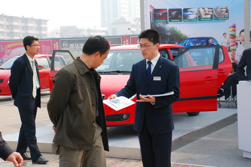 中新網(wǎng)4月19日電在2009(第六屆)全國百強(qiáng)縣市汽車巡展壽光站的現(xiàn)場筆者發(fā)現(xiàn)了這樣的一幕,與其他廠商不同,上海大眾斯柯達(dá)的經(jīng)銷商濰坊天和汽車銷售服務(wù)有限公司的銷售人員,不但在展位為前來咨詢的消費(fèi)者進(jìn)行講解,而且還走出展位,走到展位外面為消費(fèi)者講解,吸引消費(fèi)者來了解更多車輛信息。
