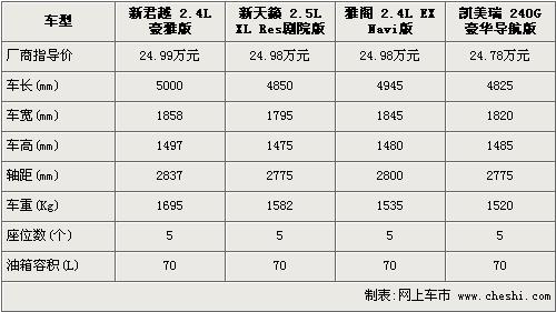 提到中級(jí)車市場(chǎng),人們便會(huì)很快的想到新雅閣、新凱美瑞和新天籟這三款日系車型,它們?cè)谥屑?jí)車市場(chǎng)里算是鼎鼎有名的“三位”了。隨著今年7月8日別克繼新君威后的又一力作新一代君越的正式上市,中級(jí)車市場(chǎng)迎來(lái)了又一款“重量級(jí)”車型。新君越的上市更加鞏固了別克在中級(jí)車市場(chǎng)的位置,并且給同級(jí)別的中級(jí)車帶來(lái)了更強(qiáng)的競(jìng)爭(zhēng)力。既然有新車型加入了隊(duì)列,那么同級(jí)車之間價(jià)格和配置的“競(jìng)爭(zhēng)戰(zhàn)”是必不可少的。下面我們就為您挑選了新君越2.4L豪雅型、新天籟2.5L XL RES劇院版、雅閣2.4L EX導(dǎo)航版和凱美瑞240G 豪華導(dǎo)航版四款價(jià)格相近的中級(jí)車作為比較,看看這四款熱門車?yán),哪款車型更適合將要購(gòu)入中級(jí)車的您。