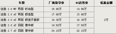 據(jù)4S店銷售人員介紹,目前購(gòu)買途勝全系可以優(yōu)惠現(xiàn)金2萬元,其中2.0兩驅(qū)時(shí)尚版優(yōu)惠后售價(jià)為14.98萬元。除了現(xiàn)金優(yōu)惠外,此前贈(zèng)送加油卡的活動(dòng)已經(jīng)不再舉行,F(xiàn)車方面,各經(jīng)銷商處現(xiàn)車數(shù)量不多,部分還需要預(yù)訂,定期最快為1周時(shí)間。