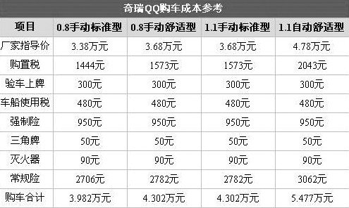 一、購(gòu)車成本,奇瑞QQ的0.8手動(dòng)標(biāo)準(zhǔn)低廉的價(jià)格,非常適合資金不足的消費(fèi)者,夠用的配置,較好的油耗能夠滿足眾多用戶的需要。1.1手動(dòng)標(biāo)準(zhǔn)版合理的價(jià)位,較高的配置,更適合大眾群體選購(gòu)。