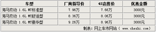 在市場(chǎng)中銷(xiāo)售有段時(shí)間的1.6L歡動(dòng)新車(chē),現(xiàn)已進(jìn)入各個(gè)海馬經(jīng)銷(xiāo)商展廳,現(xiàn)車(chē)充足顏色齊全。在售的三款新車(chē)均為手動(dòng)版車(chē)型。除直接享受?chē)?guó)家1.6L車(chē)型的購(gòu)置稅優(yōu)惠政策外,并有現(xiàn)金3千元優(yōu)惠;銷(xiāo)售人員表示,現(xiàn)金優(yōu)惠也可換為等值的裝飾禮包,同樣超值,F(xiàn)金優(yōu)惠配合購(gòu)置稅優(yōu)惠,則大大減輕了消費(fèi)者的購(gòu)車(chē)負(fù)擔(dān)。