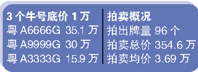 這次競(jìng)拍會(huì)上最受矚目的無疑是粵A3333G、粵A6666G、粵A9999G三個(gè)底價(jià)1萬的四連號(hào)。最后,550號(hào)競(jìng)拍者以35.1萬高價(jià)競(jìng)拍粵A6666G成功,成為本場(chǎng)“標(biāo)王”。而上期標(biāo)王粵A6666G僅拍出16萬元。(記者譚德波)