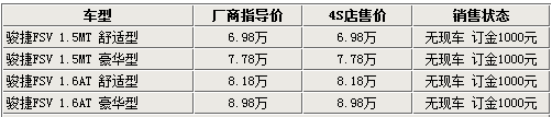 經(jīng)銷商透露,現(xiàn)在各店內(nèi)的FSV基本為展車或已被客戶預(yù)訂的車輛,基本沒有現(xiàn)車可以滿足消費者的需要,消費者如需購買可以繳納1千元訂金后等待一個月左右即可提車。由于駿捷FSV為剛剛上市的新車,所以店內(nèi)沒有任何形式的優(yōu)惠,請消費者諒解。