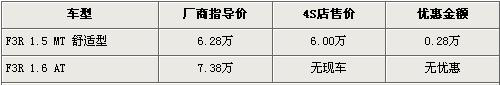 據(jù)比亞迪汽車北京地區(qū)4S店銷售人員介紹,目前北京在售的比亞迪F3R只有1.5L手動舒適版車型,并且廠商指導價也從6.08萬元回升到了6.28萬元。目前購買此車的消費者可以得到2800元的優(yōu)惠,經優(yōu)惠后售價降到了6萬元。