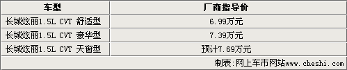 據(jù)悉,長城炫麗CVT將在9月2日上市,首先會推出三款車型,其中1.5L舒適型和1.5L豪華型的售價分別為6.99萬元和7.39萬元。因為炫麗車型一直就沒有出天窗版,所以1.5L CVT 天窗版的價格還不明朗,預(yù)計在7.69萬元左右。目前炫麗CVT已經(jīng)有部分現(xiàn)車抵達4S店,但因為新車備案原因不能上牌,目前只能夠接受預(yù)訂。