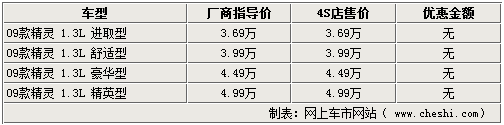 長(zhǎng)城09款精靈目前在4S店內(nèi)已經(jīng)有現(xiàn)車銷售,店內(nèi)沒(méi)有的車型顏色需要預(yù)訂,訂金2000元,等一周即可提車。09款精靈基于老款車型下調(diào)了原廠商指導(dǎo)價(jià),指導(dǎo)價(jià)相比老款車型降幅達(dá)4000元,但09款精靈現(xiàn)車目前在4S店內(nèi)還沒(méi)有任何優(yōu)惠。