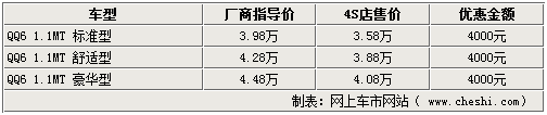 據(jù)奇瑞QQ6專營店銷售人員介紹,奇瑞QQ6系列車型比較齊全,目前全系都有一定的優(yōu)惠幅度,除現(xiàn)車較少的車型需要提前預(yù)訂以外,全系車型均可以優(yōu)惠4000元。