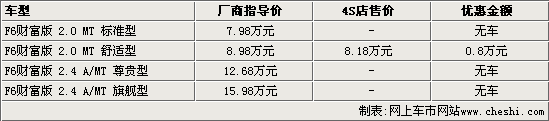 據(jù)比亞迪4S店銷售人員介紹,目前比亞迪F6只有2.0L手動(dòng)舒適型有現(xiàn)車銷售,可以優(yōu)惠8000元現(xiàn)金,如果到店詳談還可以有更多的優(yōu)惠政策。而2.0L手動(dòng)標(biāo)準(zhǔn)型因?yàn)榕渲幂^低,北京市場(chǎng)一直就沒(méi)有現(xiàn)車;2.4L車型也需要預(yù)定,交付訂金后需等半個(gè)月左右即可提車。
