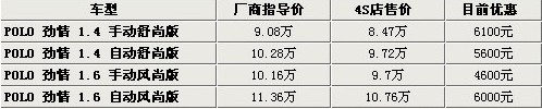據(jù)4S店銷售人員介紹:目前POLO勁情全系僅為4款車型。之前的1.4升手動(dòng)擋兩款車型合并為1.4手動(dòng)舒尚版,1.4升自動(dòng)擋兩款車同樣合為1.4自動(dòng)舒尚版。其余1.6升兩款車型不變。目前全系最高優(yōu)惠6100元,其余三款車優(yōu)惠幅度都有所不同。目前全系現(xiàn)車非常少,預(yù)定需等1個(gè)月時(shí)間,如預(yù)定黑色和白色需等2個(gè)月以上,建議購(gòu)買銀色、紅色、藍(lán)色車款。