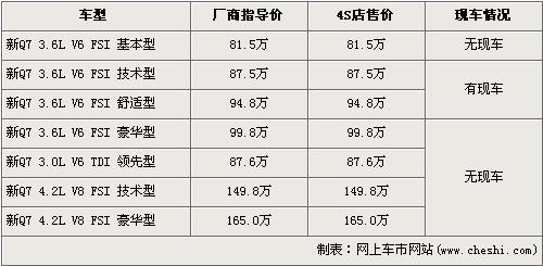 據北京奧迪4S店銷售人員介紹,新款的奧迪Q7有三個排量共7款車型,售價區(qū)間為81.5萬元-165萬元。目前店內已經到第一批先期預訂的奧迪新Q7現車,車型為3.6L技術型和3.6L舒適型。現在欲購買新Q7的消費者需交1萬元訂金,下個月中旬方可提車。