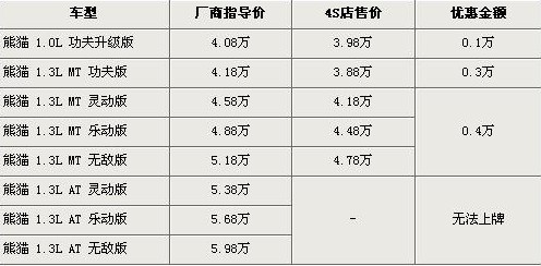 據(jù)吉利汽車4S店銷售人員介紹,吉利熊貓近期有最高4000元的優(yōu)惠。新推出的1.0L車型優(yōu)惠為1000元,售價(jià)降到了3.98萬(wàn)元。1.3L手動(dòng)功夫版優(yōu)惠3000元,售價(jià)降到了3.88萬(wàn)元,其他手動(dòng)擋車型優(yōu)惠4000元。由于熊貓1.3L自動(dòng)檔車型尾氣排放不合格,所以無(wú)法在北京上牌照。銷售人員還介紹,目前1.0L車型較緊張,1.3L車型現(xiàn)車充足。