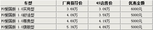 據(jù)比亞迪汽車4S店銷售人員介紹,比亞迪F0愛國版igo系列車型的現(xiàn)車并不是很齊全,實(shí)用型和舒適型都有現(xiàn)車,尊貴型和旗艦型則需要預(yù)訂,大概10-15天即可提車。而目前1.0L實(shí)用型和舒適型都有現(xiàn)車,其中實(shí)用型可以優(yōu)惠6000元,優(yōu)惠后售價(jià)已經(jīng)接近3萬;而其他車型只可以優(yōu)惠5000元現(xiàn)金。