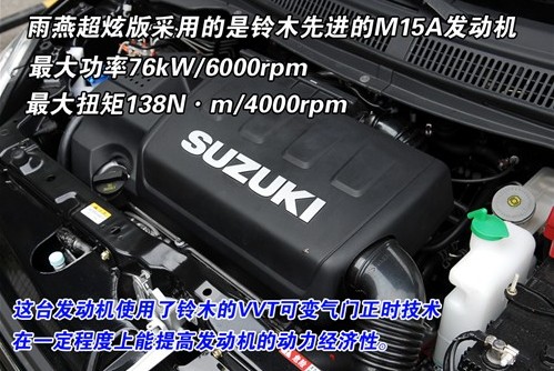 售價達(dá)到9.88萬元的1.5炫酷版AT在強(qiáng)調(diào)性價比的雨燕全系中是頂配車型,因此勢必要配備一些豪華型配置。諸如全車六安全氣囊、多功能方向盤以及自動空調(diào)都是小型車中少有的。而此車型搭載的1.5L發(fā)動機(jī)更是值得推薦。這臺M15A發(fā)動機(jī)是雨燕上市一段時間后才追加的動力單元,目的就是提高雨燕的動力表現(xiàn)。1.5L發(fā)動機(jī)采用了全鋁材質(zhì)重量更輕,同時配有VVT可變氣門正時系統(tǒng),在燃油經(jīng)濟(jì)性方面也得到了提升。