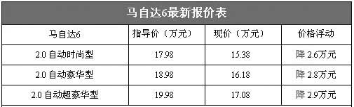 馬自達6是一款非常經(jīng)典的車型,現(xiàn)在更是憑借著突出的性價比持續(xù)熱銷。昨日,我們從北京地區(qū)的一些一汽馬自達汽車綜合經(jīng)銷商處了解到,近期馬自達6的價格穩(wěn)定,降幅在2.8萬元左右,其中馬自達6 2.0自動時尚型目前的售價為15.38萬元,性價比非常不錯。以下是馬自達6最新詳細報價表: