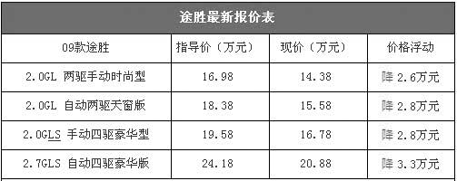 09款途勝上市后銷量一直都不錯,8月份售出了4331輛,在國內SUV銷量榜中排在第五位,比同價位競爭對手獅跑和逍客高出不少。昨日,我們從北京地區(qū)的一家北京現(xiàn)代汽車綜合經(jīng)銷商處了解到,近期09款途勝的價格已經(jīng)趨于穩(wěn)定,最高可優(yōu)惠3.3萬元。以下是09款途勝最新報價表: