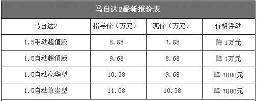 今年4月初,長安馬自達推出了兩款馬自達2超值版車型,使得馬自達2 1.5L排量的最低售價降至8.88萬元,對于購車預算在9萬元以內的朋友來說,又多了一款選擇的車型。近日,我們從北京地區(qū)的一家長安馬自達汽車綜合經銷商處了解到,目前馬自達2 1.5L最高可優(yōu)惠1萬元,其中超值版最低配售價已經降至7萬元區(qū)間,性價比和新嘉年華相比高出不少。以下是馬自達2最新報價表:
