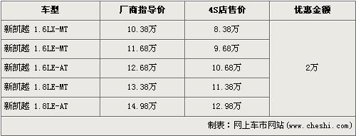 據(jù)4S店銷售人員介紹,新凱越分為1.6L與1.8L兩種排量車型,目前新凱越全系優(yōu)惠2萬(wàn)元,較上個(gè)月的優(yōu)惠降幅有所下降。經(jīng)優(yōu)惠后,全系最低配的1.6LX-MT車型售價(jià)下降到了8.38萬(wàn)元。經(jīng)優(yōu)惠后,1.8L手動(dòng)和自動(dòng)兩款車型售價(jià)也下降到了11.38萬(wàn)元和12.98萬(wàn)元。銷售人員還介紹,目前店內(nèi)現(xiàn)車齊全,是消費(fèi)者挑選的較好時(shí)機(jī)。