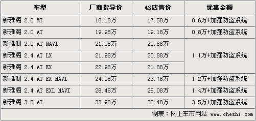 據(jù)廣州本田北京地區(qū)4S店銷售人員介紹,現(xiàn)購買新雅閣均有6千-3.5萬不等的優(yōu)惠,最低售價17.58萬,另贈送“車行無憂”加強防盜系統(tǒng),例如您的車被拖走也會第一時間知道。3.5AT頂級型目前現(xiàn)車較少,則需要預定。