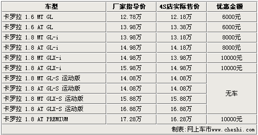 據(jù)一汽豐田4S店銷售人員介紹:目前2.0L排量的運(yùn)動(dòng)版車(chē)型無(wú)現(xiàn)車(chē)銷售,購(gòu)買(mǎi)其他車(chē)型則可以享受到8000元——10000元的現(xiàn)金優(yōu)惠。入門(mén)級(jí)的1.6 MT GL版車(chē)型售價(jià)降到了12.18萬(wàn)元,高配的1.8 AT PREMIUM版經(jīng)10000元優(yōu)惠后,售價(jià)也降到了16.28萬(wàn)元。