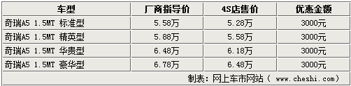 據(jù)奇瑞4S店銷售人員介紹,目前各點內(nèi)均主要銷售1.5升的A5車型,老款的A516已經(jīng)停產(chǎn),4S店都已經(jīng)沒有庫存車銷售,未來也不會再投產(chǎn)進行銷售。目前奇瑞A515精英型等車型在店里都有現(xiàn)車銷售,為迎接國慶以及中秋雙節(jié)的來臨,現(xiàn)在購A5全系均可享受3000元的優(yōu)惠。