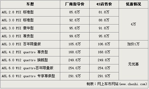 據(jù)北京奧迪經(jīng)銷店銷售人員介紹,目前購買2.8L以及3.0L奧迪新A8L車型的消費者,可以得到4萬元的現(xiàn)金優(yōu)惠。經(jīng)優(yōu)惠后,全系入門級的2.8L標準型的售價從85.8萬元下降到了81.8萬元。而新上市的3.0L百年限量版車型店內(nèi)只有一輛現(xiàn)車,并且提車需加1萬元,售價從105.8萬元上升到了106.8萬元。