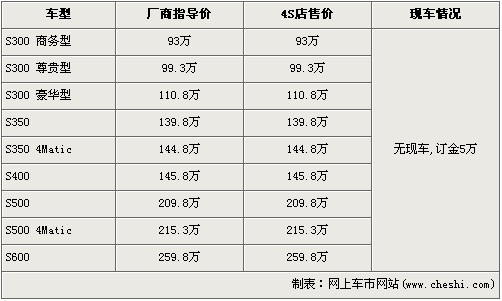 據(jù)北京奔馳4S店銷售人員介紹,奔馳新一代S級(jí)共有9個(gè)車型,售價(jià)區(qū)間為93萬(wàn)元-25.8萬(wàn)元。前端時(shí)間到店的奔馳新S級(jí)S350L已經(jīng)全部售出,目前店內(nèi)全系無(wú)現(xiàn)車。欲購(gòu)買的消費(fèi)者需交訂金5萬(wàn)元,最早下個(gè)月可提車。