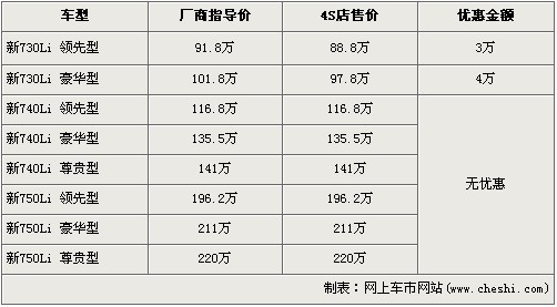據(jù)北京寶馬經(jīng)銷店銷售人員介紹,寶馬新7系共分為730Li、740Li、750Li三種等級(jí)車型,售價(jià)區(qū)間為91.8萬(wàn)元-220萬(wàn)元。目前購(gòu)買(mǎi)新730Li領(lǐng)先型的消費(fèi)者可以得到3萬(wàn)元的優(yōu)惠,新730Li豪華版車型可以優(yōu)惠4萬(wàn)元。消費(fèi)者還介紹,除了新730Li有現(xiàn)車外,其余車型均需預(yù)訂,訂金是10萬(wàn)元,最早12月份可提車。