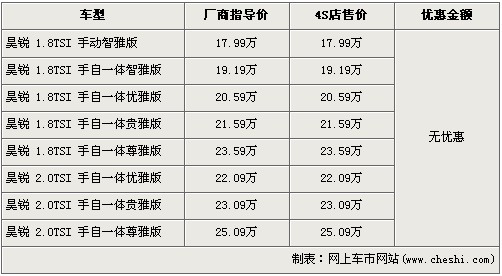 據(jù)北京斯柯達(dá)經(jīng)銷店銷售人員介紹,斯柯達(dá)昊銳共分為8個(gè)車型,售價(jià)區(qū)間為17.99-25.09萬(wàn)元。目前店內(nèi)昊銳雖然沒有任何優(yōu)惠,但是店內(nèi)的昊銳現(xiàn)車比較充足,消費(fèi)者挑選的空間也較大。