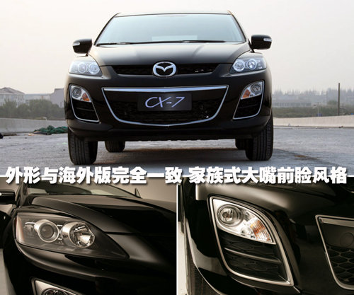 前臉采用了馬自達(dá)新一代大嘴設(shè)計(jì),較大的進(jìn)氣格柵以及更加突出的車(chē)標(biāo)。前保險(xiǎn)杠中的鍍鉻邊框使CX-7更加時(shí)尚與運(yùn)動(dòng),黑底大燈內(nèi)采用遠(yuǎn)近光分體設(shè)計(jì),近光裝備了透鏡氙燈。
